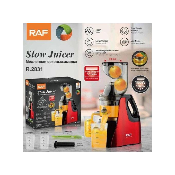 RAF Slow Juicer – 150W Slow Juice Extractor for Whole Fruits with a Large 80mm Inlet and Anti-Drip Function. 400ml Juice Jug and 400ml Pulp Collector. For Freshly Squeezed Juices.