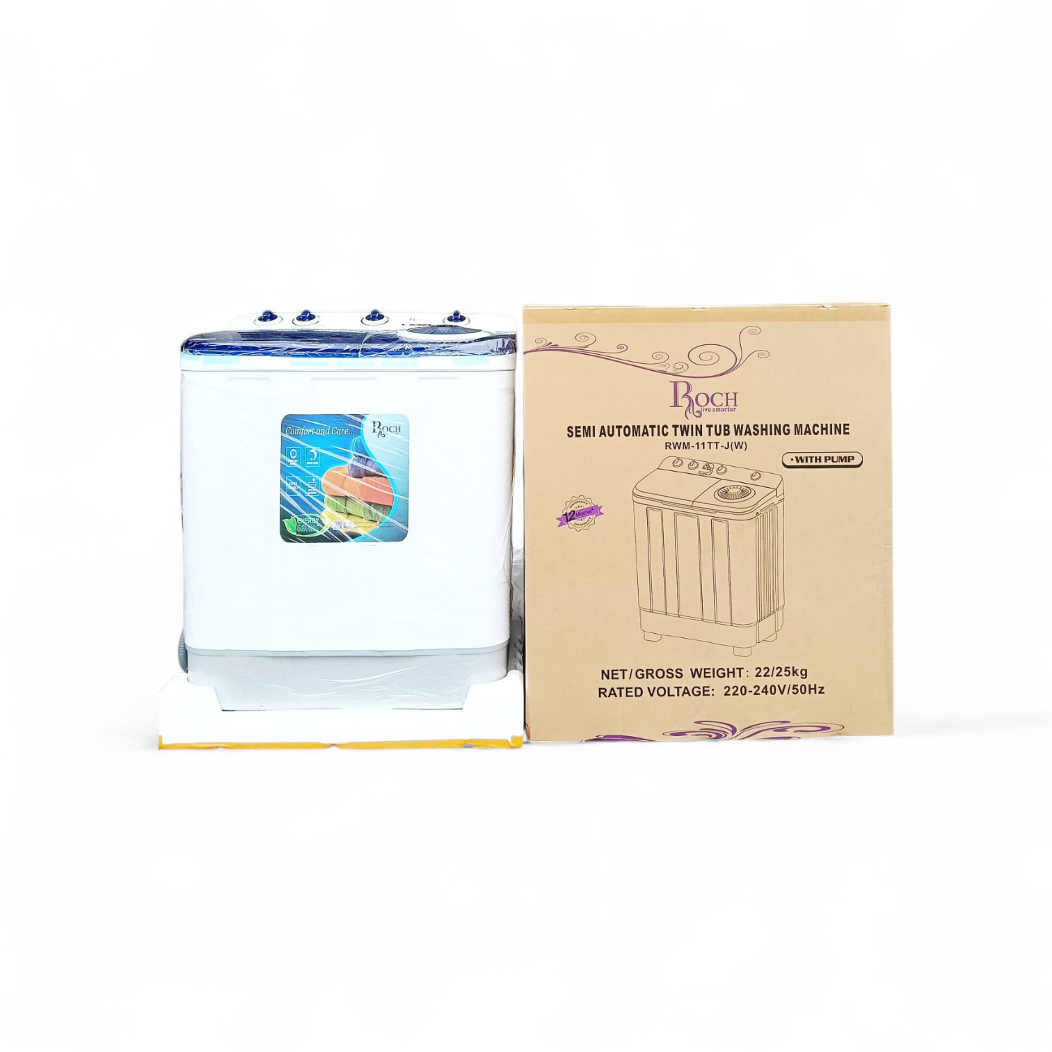 The ROCH washing machine 11kg twin tub semi automatic is a durable, high-capacity (11 kg wash/approx. 6 kg spin) laundry appliance featuring separate wash and spin tubs for simultaneous, efficient cleaning. Designed for medium-to-large households, it offers manual control over wash cycles, a rust-proof body, and a powerful, low-noise motor to handle bulky items